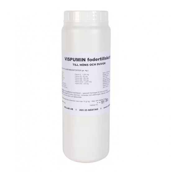 LagerstatusArtikelnummer450880ProducentWillabEgenskaberVispumin er et høj effektivt fodertilskud specielt udviklet til høns og duer. Vispumin indeholder 24 forskellige vitaminer, mineraler og elektrolytter. Bland 1 tsk/kg foder/dag og efter en kort periode får dyrene en skinnende og flot fjerdragt.