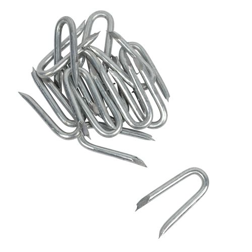 Krampe i varmforsinket stål med modhage til fastgørelse af net og tråd i træstolpe. Ca. 270 stk.