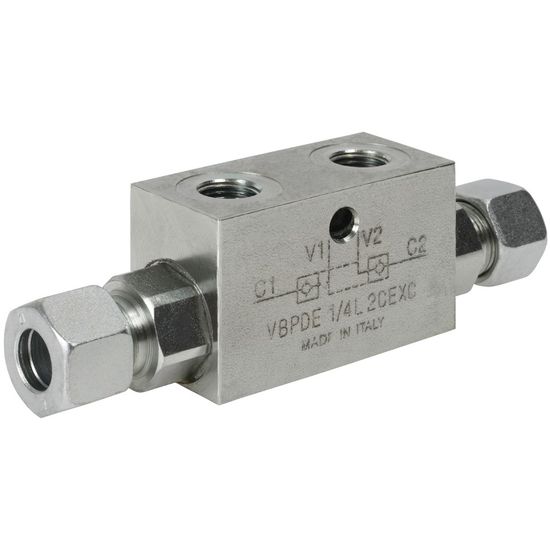Maks. tryk: 350 barDobbelt låseventil, hvor driftstrykket på den ene side åbner den låsbare ventil på den anden side.