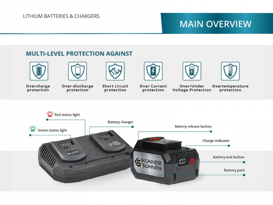 En betydelig del af udgiften til batteridrevne værktøjer er forbundet til batterierne. Muligheden for at bruge det samme batteri til flere værktøjer giver store besparelser. Universelle batterier fra Könner & Söhnen® er kompatible med alle batteridrevne haveredskaber fra mærket. Derfor behøver brugerne kun at købe ét batteri (2 stk til denne motorsav) med ønsket kapacitet og en oplader én gang og kan derefter bruge dem med en hvilken som helst enhed i serien.