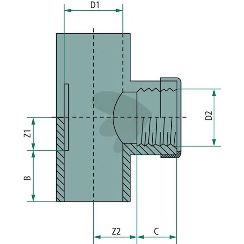 T-stykke med 2x limmuffe og 1x indvendig gevind, PVC-U