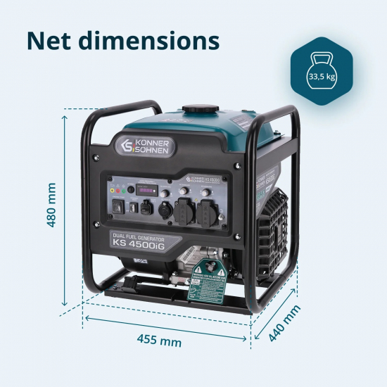 Benzingeneratoren KS 4500i med inverterteknologi og en nominelt effekt på 4,2 kW leverer en stabil og højkvalitets strømforsyning til husholdningsapparater og sikrer uafbrudt drift af kontorer, butikker, små virksomheder, sundhedsklinikker eller driver mindre elværktøj i værksteder.