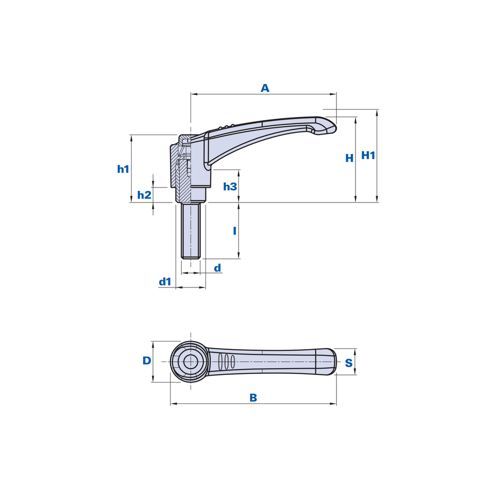 - mål: A=45mm, B=52mm, D=13,6mm, S=9,4mm, H=30mm, H1=34mm, h1=25mm, h3=10,5mm, d1=10mm, h2=4,2mm, d=M5, I=20mm